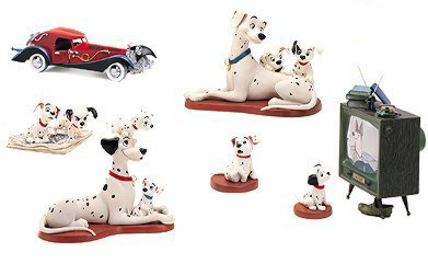 "101 Dalmations" Hot News from the Twilight Bark! Where did all those puppies go? Yes, it's true, the entire scene of "101 Dalmatians" (except for the opening title) was retired in a surprise announcement during Mr. Toad's Enchanted Evening at Disneyland on October 28, 1999. The pieces honored with retirement include: Pongo, Perdita, Lucky with Television, Rolly, Puppies on Newspaper and Cruella's Car. (The Cruella's Car ornament was retired in July with six other Christmas ornaments - see above). |