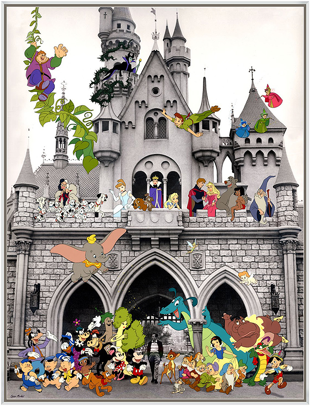 The piece fits the "Made in California" theme and pays homage to Disneyland and Walt Disney himself. The sericel features 63 colors and 64 characters surrounding Walt Disney walking through Sleeping Beauty's Castle the day before Disneyland opened. It celebrates the multitude of characters that Walt helped to create...including some lesser-known characters that only the convention attendees may be familiar with.