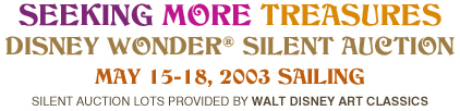 The Disney Wonder ® Silent Auction which will take place during the 2003 Celebration of Walt Disney Art Classics sailing May 15-18, 2003. Passengers will be able to mark down their bids on tablets in front of the auction items until the deadline. The auction items will be on display during the sailing in the Preludes area on Deck 4 near the Walt Disney Theatre where event seminars will be held. Subsequent bids need to exceed previous bids by a certain amount. Suggested opening bids are provided for each item. There will be no auctioneer and auction event. Rather, bidding for the silent auction takes place during the sailing until the deadline with highest bidder winning the opportunity to purchase the lot. There are some truly wonderful auction lots from Walt Disney Classics Collection, Walt Disney Animation Art, Walt Disney Art Classics and Lenox. There may be other auction lots provided by the Disney Cruise Line, but these items provided by WDAC are planned to be available for bidding. Images not available at this time.
