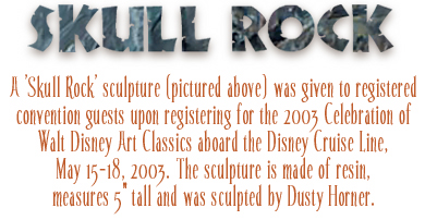 Registered convention guests received a Skull Rock (pictured above) as a gift upon registration for the 2003 Celebration of Walt Disney Art Classics Convention Cruise (May 15-18, 2003). Skull Rock is made of resin and measures 5" tall. Skull Rock can be used to compliment the featured sculpture, "Hooray for Captain Pan!" but also work with the retired Peter Pan scene featuring Peter Pan, Captain Hook, Mr. Smee and the Crocodile and/or the Enchanted Places release of the Jolly Roger (Captain Hook's Ship) as pictured below: