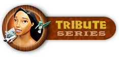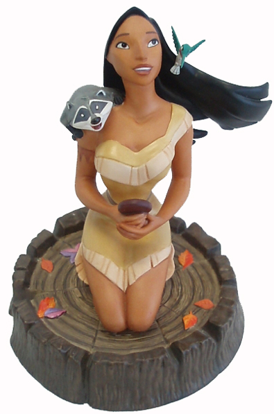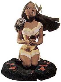 Flit: Bronze miniature Flit perches on Pocahontas' windblown hair.